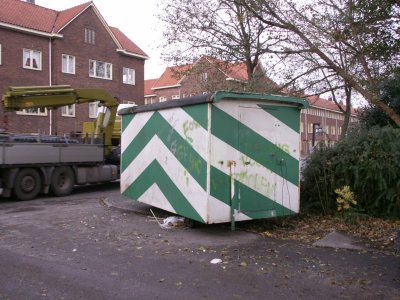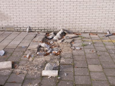 Het electriciteitskastje van de omvergetrokken lichtmast.